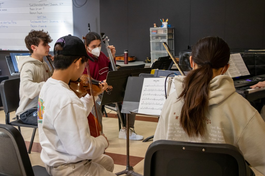After 40 years and a pandemic, Jazz Band is the only ensemble left in the chamber system. Babcock and the four student members–cellists Ryan Chen (12th) and Evan Stoddard (8th) and violinists Sean Chen (8th) and Jayson Park (7th)–meet bright and early every Tuesday and Thursday in Instrumental Music Studio.